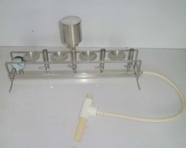 2.將濾器接桿上的橡膠塞,插入不銹鋼底座,濾器的多小孔平面上裝上浸泡的濾膜,放上不銹鋼濾器倒入水樣至相應刻線,便可進行抽濾。